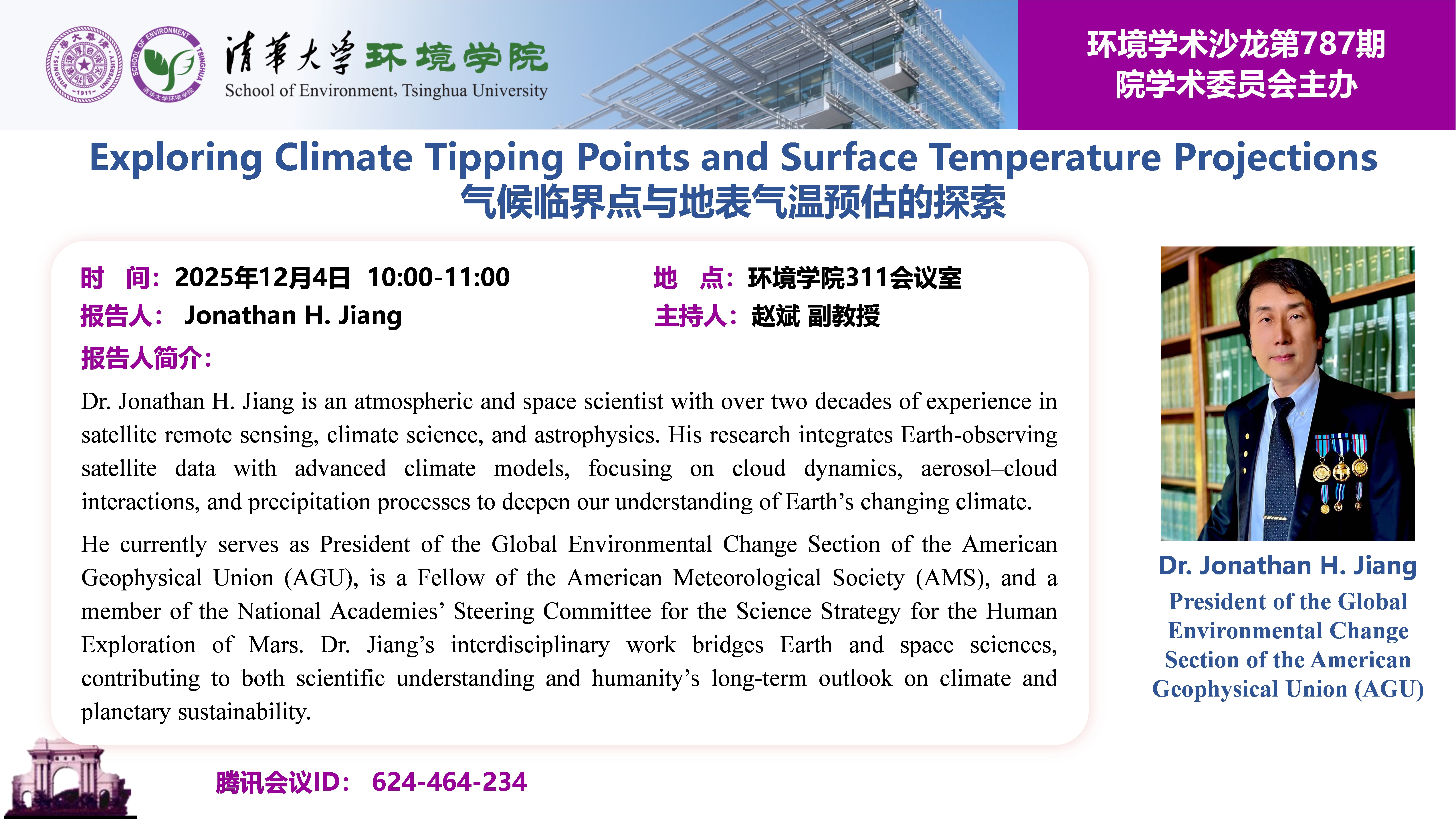 报告人:Dr. Jonathan H. Jiang, President of the Global Environmental Change Section, American Geophysical Union (AGU)