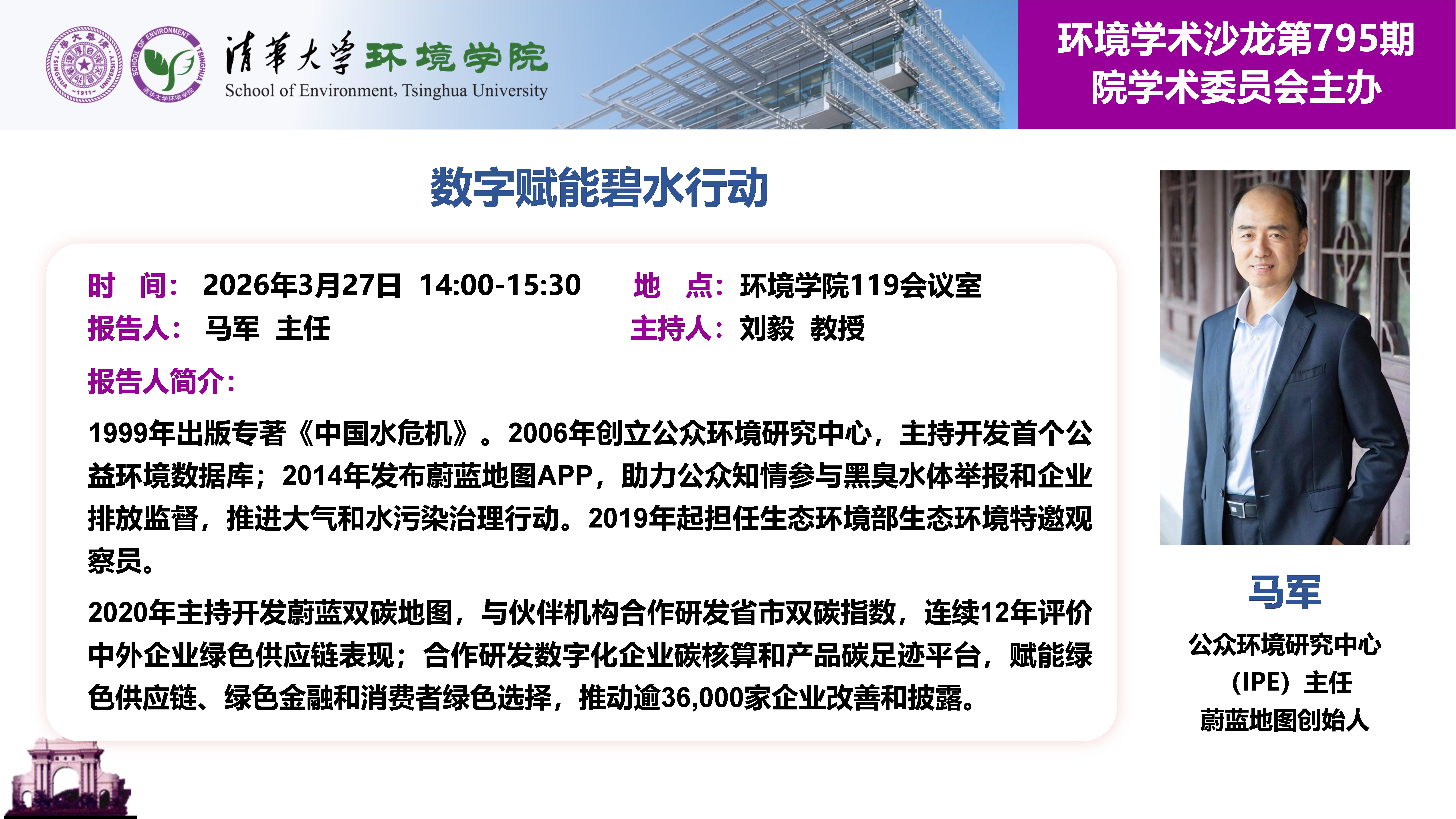 报告人:马军,公众环境研究中心(IPE)主任,蔚蓝地图创始人