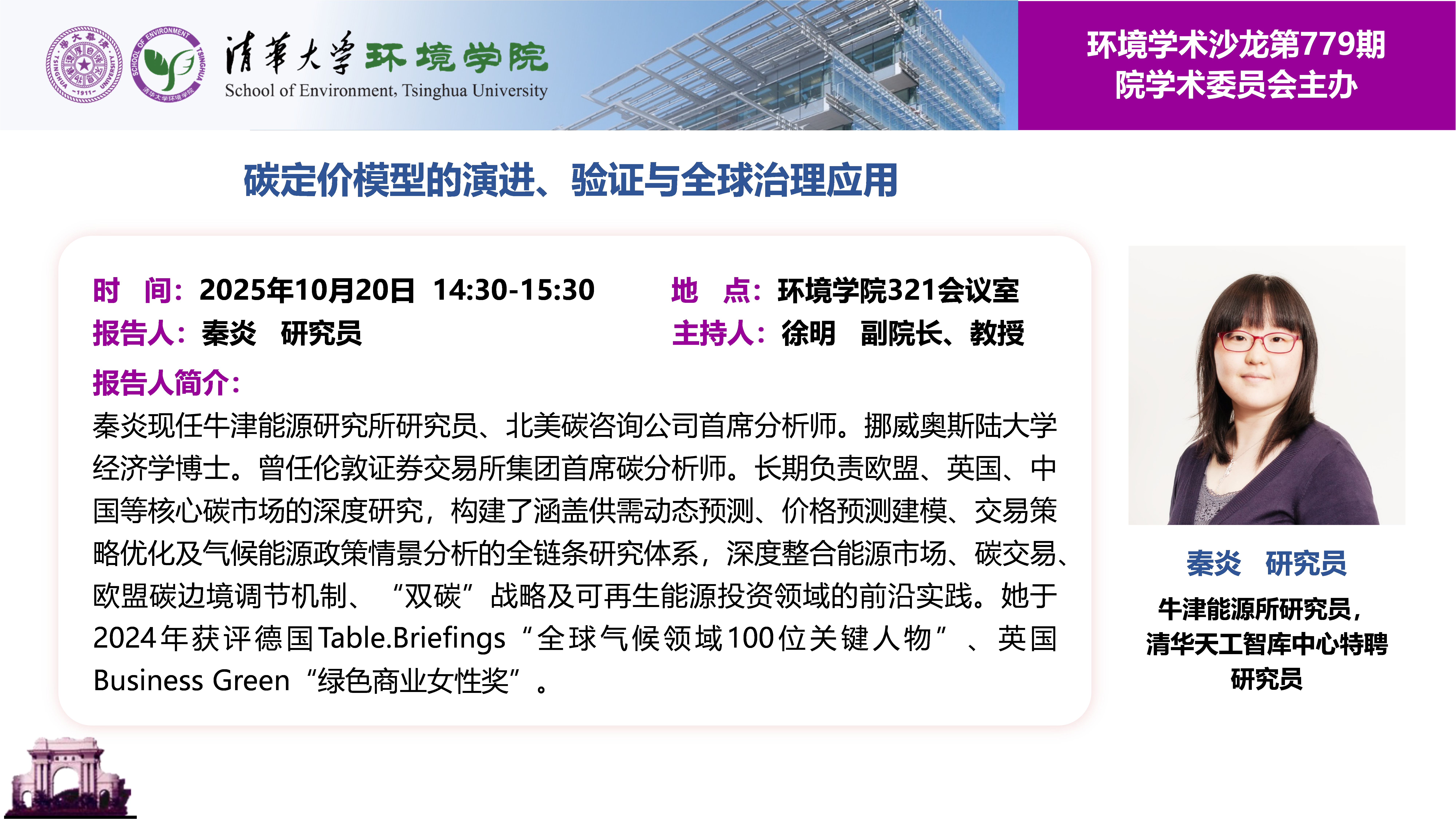秦炎现任牛津能源研究所研究员、北美碳咨询公司首席分析师。挪威奥斯陆大学经济学博士。曾任伦敦证券交易所集团首席碳分析师。长期负责欧盟、英国、中国等核心碳市场的深度研究,构建了涵盖供需动态预测、价格预测建模、交易策略优化及气候能源政策情景分析的全链条研究体系,深度整合能源市场、碳交易、欧盟碳边境调节机制、“双碳”战略及可再生能源投资领域的前沿实践。她于2024年获评德国Table.Briefings“全球气候领域100位关键人物”、英国Business Green“绿色商业女性奖”。