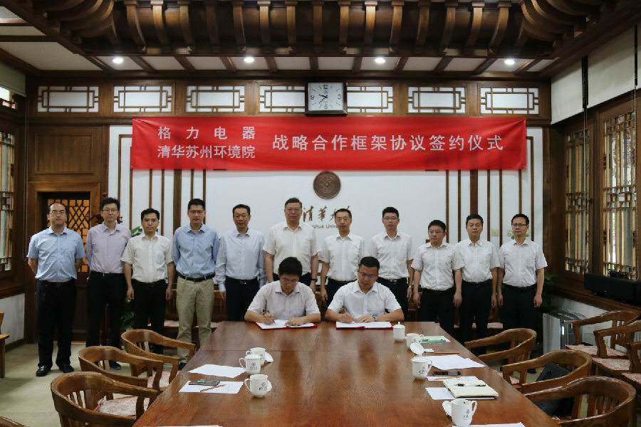 清华大学环境学院2019年6月20日电 6月17日,清华苏州环境创新研究院(以下简称“苏州环境院”)与珠海格力电器股份有限公司(以下简称“格力电器”)战略合作框架协议签约仪式在清华大学工字厅举行。清华大学副校长尤政、环境学院党委书记兼苏州环境院院长刘毅、格力电器副总裁庄培、格力绿色副总经理陈龙等出席签约仪式。