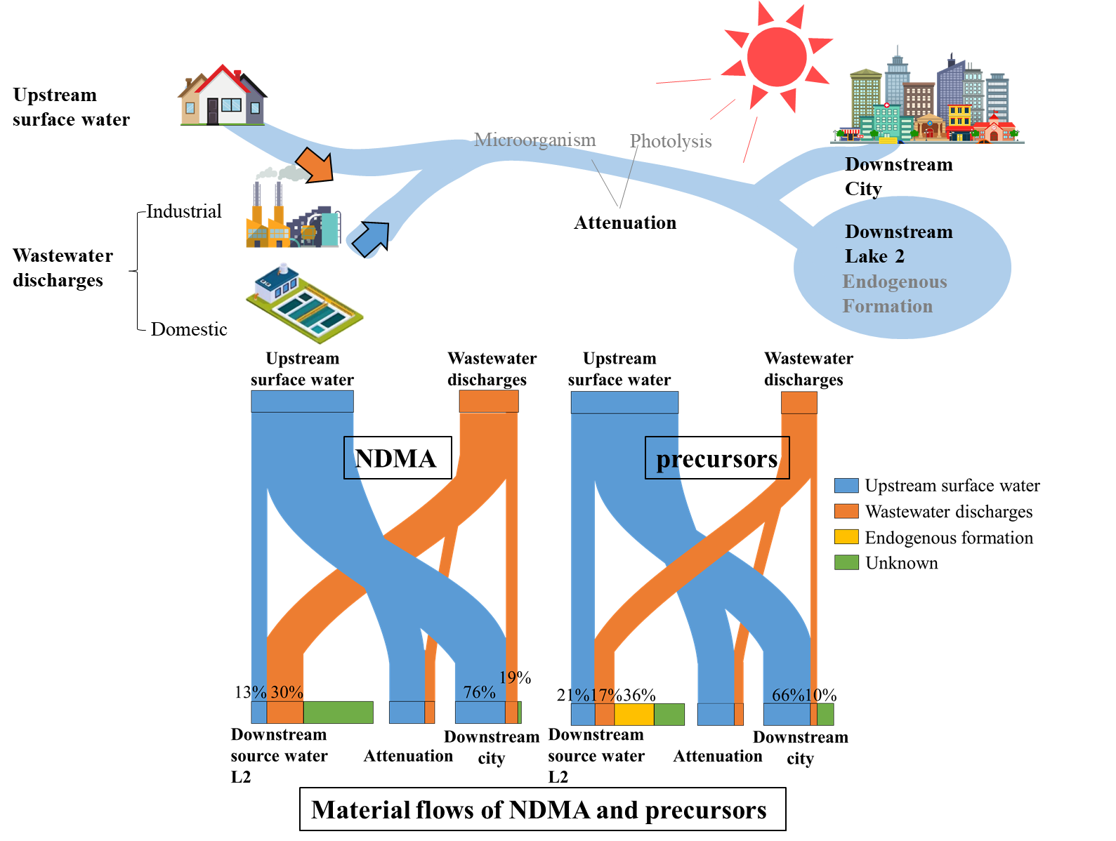 该团队以我国华东某城市为研究对象,在全市范围内设置了50多个代表性的河网采样点、30多个污废水采样点以及2个水源地点位。根据水质检测结果和径流及排水流量数据,对该河网城市各径流逐一进行源和汇中亚硝胺及前体物的负荷计算。同时,逐小时计算亚硝胺在天然水体中的光解、生物降解等自然衰减情况。此外,根据团队提出的微生物代谢氨基酸生成亚硝胺及其前体物的新机制,估算城市水系统和水源地中的内源生成情况。将上述径流机制、自然衰减机制和内源生成机制的结果汇总后,最终得到该城市水系统中亚硝胺及前体物的物质流,并进行定量化源解析。